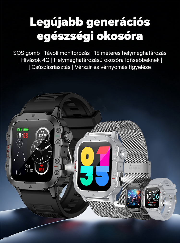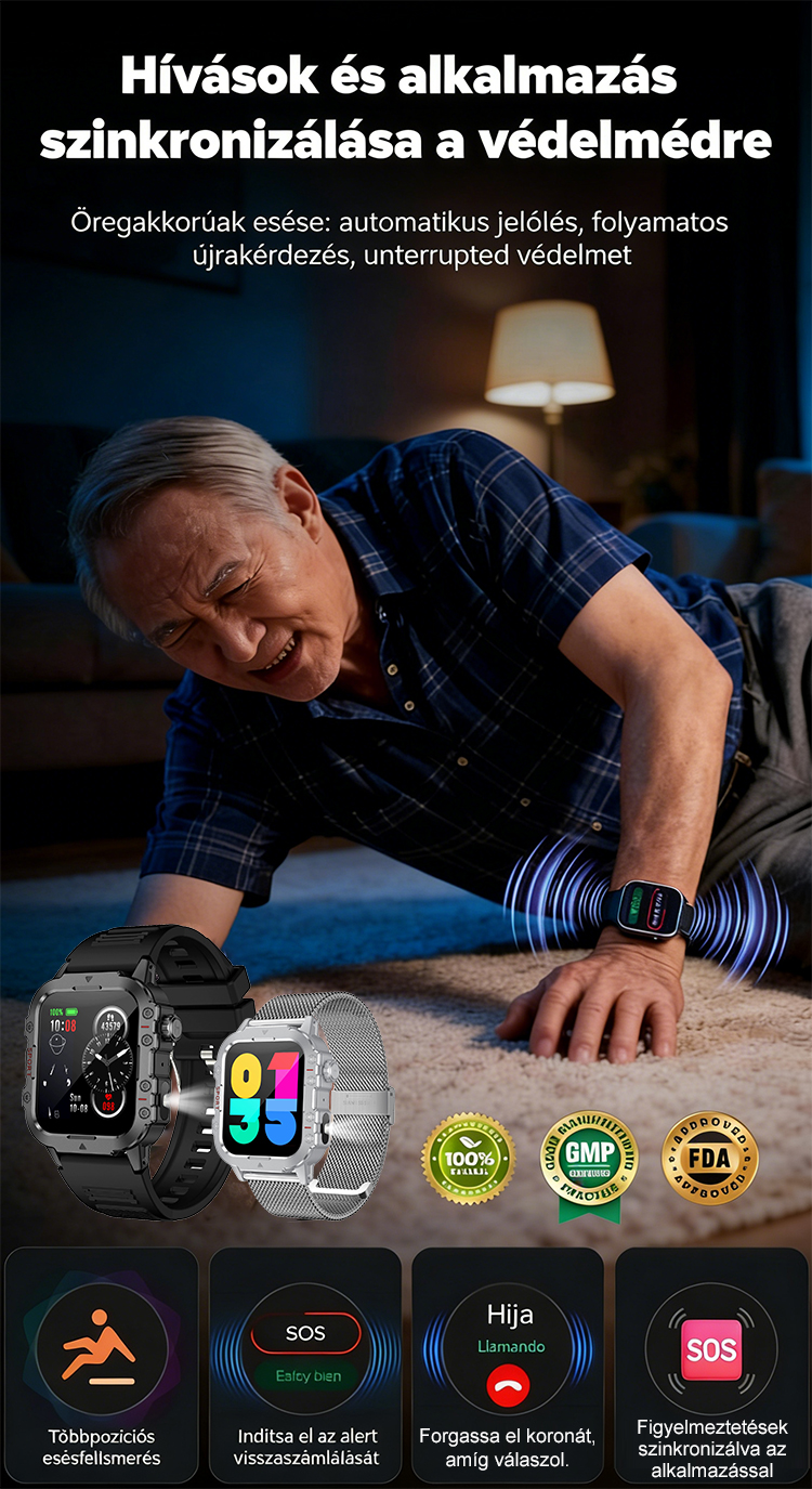 ✅ Automatikus Esésriasztás: Idősek hirtelen esése esetén az óra automatikusan segélyjelet küld, folyamatos védelmet nyújtva.